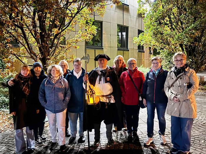 Kaum dort angekommen, ließ Günter nicht lange auf sich warten. In seiner traditionellen Arbeitskleidung erschien er gut gelaunt und begrüßte die Gruppe herzlich. Von diesem Moment an begann eine faszinierende Reise durch die Geschichte und Geheimnisse der Stadt. Der Nachtwächter sprudelte nur so vor Informationen – ein wahrer Schatz an Wissen, den er mit Begeisterung weitergab. Mit zahlreichen Anschauungsmaterialien im Gepäck führte er die Schützenladies zu versteckten Ecken und historischen Orten, die im Alltag oft übersehen werden.