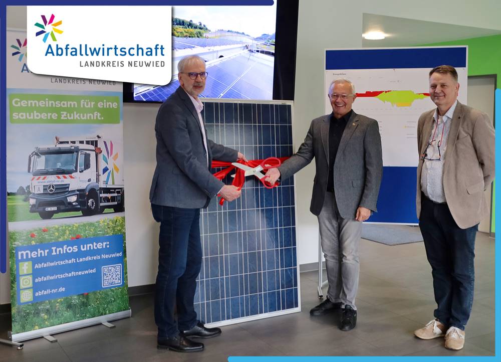 Landrat Achim Hallerbach (Mitte), Vorstand der Abfallwirtschaft Landkreis Neuwied Andreas Saal (rechts) und Vorstand der Rhein-Hunsrück-Entsorgung Thomas Lorenz (links) haben gemeinsam den symbolischen Banddurchschnitt vollzogen. Mit einer Anlagengröße von rund 600 kWp Modulleistung und einer erwarteten jährlichen Energieerzeugung von etwa 540.000 kWh wird künftig ein wesentlicher Teil des eigenen Energiebedarfs – insbesondere für die Abluftreinigungsanlage (RTO) sowie die Intensivrotte – durch umweltfreundlichen Solarstrom gedeckt.