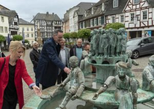 Der Rundgang setzte sich fort vom Burgplatz hinauf zur Rheinstraße, wo der Marktplatz mit dem beeindruckenden Ratsbrunnen die Aufmerksamkeit des Ministers erregte. Die beweglichen Figuren und die Symbolik des Brunnens faszinierten Ebling. Lehmann hob dabei die bedeutende Rolle der Landesförderung hervor, um die Schönheit der Altstadt zu bewahren und fortzuentwickeln.