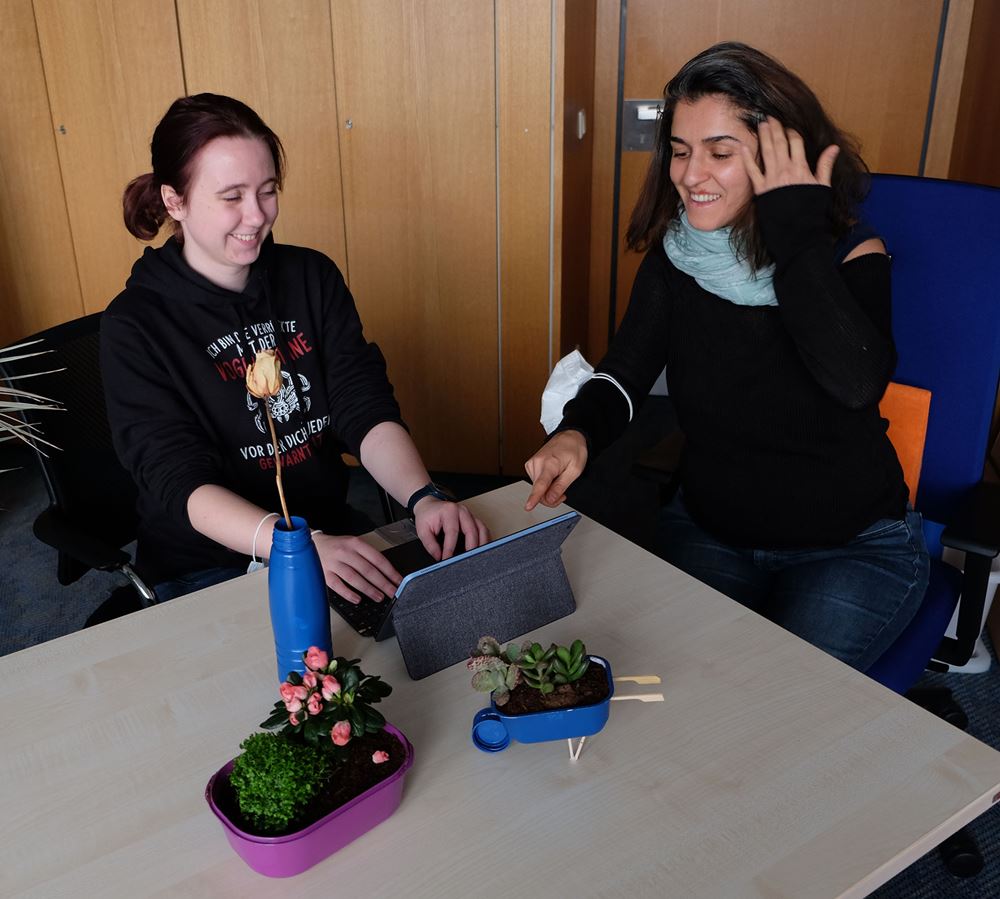 Foto: Lisa Höfer (links) und Dr. Zuhal Gültekin blicken auf eine Deko-Schubkarre, die aus einer Butterdose, aus Flaschendeckeln und Schaschlikspießen gefertigt wurde; der Blumentopf war einst eine Eisschachtel, die Vase eine pfandfreie Flasche. Kleine Projekte können große Wirkung erzielen, sind sich die beiden sicher.