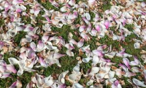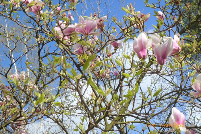 Während die Kirschblüten gerade beginnen sich zu entfalten, neigt sich die Blüte der Magnolien dem Ende entgegen. Die Magnolie in ihren vielfältigen Formen (man zählt bis zu 200, die alle aus Ostasien oder Amerka stammen), wurde nach dem französischen Bontainker Pierre Magnol benannt. Aber nur einige Arten sind beliebte Ziergehölze, die auf ihrem kunstvollen Geäst einen herrlichen Anblick bieten. Im Internet ist nachzulesen, dass Magnolien-Arten Sträucher oder Bäume sind, die sommer- oder immergrün sind. „Die Laubblätter sind „wechselständig“ angeordnet, manchmal an dem Ende der Zweige gehäuft. Die Blüten sitzen endständig an den Zweigen, seltener auch an Kurztrieben. Sie blühen bereits früh im Frühjahr, was die Pflanzen als Ziergehölze besonders attraktiv macht. Pro Blüte gibt es viele Blütenhüllblätter, viele Staubblätter und viele Fruchtblätter, die den jeweiligen Baum (mit etlichen „Früchtchen“) schon im beginnenden Frühling so besonders attraktiv erscheinen lassen“, so heißt es in den einschlägigen botanischen Lexika, wobei diese prächtigen Baumgewächse mit ihren kunstvoll-farbenfrohen Blüten die Betrachter-innen bis vor wenigen Tagen erfreut haben und von denen derzeit Abschied genommen werden muss. (jüg) Fotos: Jürgen Grab