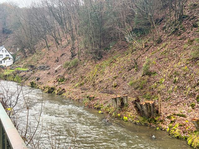 Theo Neutzling ärgerte es, dass nicht nur straßen- oder bachnahe Bäume gefällt wurden, sondern dass man gleich den gesamten Hang gerodet hatte. Frei nach dem Motto: „Wenn das Großgerät schon mal da ist …“. Die Lage auf der von der Straße abgewandten Seite der Bäche ließ auch keinen Verdacht aufkommen, dass diese Fällungen aus Verkehrssicherungsgründen erforderlich waren. „Ich fahre die B 413 in diesem Abschnitt mehrfach die Woche und in den letzten 30 Jahren wurde dort noch nie ein Baum gefällt“, so der NI-Naturschützer.