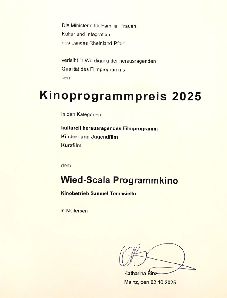 NEITERSEN – Das Kinoprogramm der „Wied-Scala“ wurde erneut ausgezeichnet – Das Kultusministerium ehrte herausragende Kinos in Rheinland-Pfalz mit dem renommierten Kinoprogrammpreis. Auch unter der neuen Leitung von Samuel Tomasiello wurde die „Wied-Scala“ zum wiederholten Mal mit dem begehrten Preis für ein außergewöhnliches kulturelles Programm ausgezeichnet.