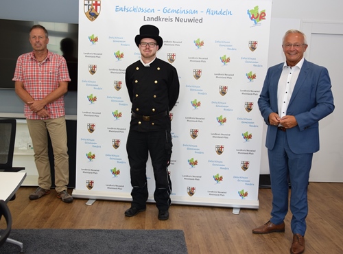 NEITERSEN-NEUSTATD (Wied) Auch Glücksbringer sind durch Corona eingeschränkt – Neuer bevollmächtigter Bezirksschornsteinfeger Marco Enßle erstattet Corona-bedingt Landrat Achim Hallerbach zeitversetzten Antrittsbesuch – Der bisherige Schornsteinfegermeister Manfred Pott aus Asbach trat mit Ablauf des Jahres 2019 seinen wohlverdienten Ruhestand an. Zum 01. März 2020 wurden die Aufgaben des Kehrbezirks Neuwied XI (Neustadt/Wied), auf den neuen bevollmächtigten Bezirksschornsteinfegermeister Marco Enßle aus Neitersen übertragen. Der Bezirk umfasst ca. 3.000 Gebäude, deren Heizungen, Kamine etc. auf ihre Sicherheit geprüft werden müssen. Die Pandemie verhinderte bis dato den üblichen Antrittsbesuch beim Landrat.