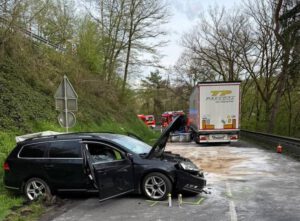 Freitagnachmittag kam es auf der L 255 zwischen Neustadt und Etscheid zu einem Verkehrsunfall zwischen einem LKW und einem PKW mit Anhänger. Der Fahrer des PKW wurde schwer verletzt. Es liefen größere Mengen Diesel aus dem Tank des LKW aus.