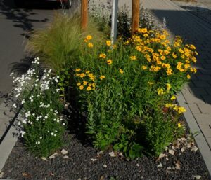 Grundschule Niederbieber: In der Lach haben die „Grünexperten“ entlang des Schulgebäudes eine 200 Quadratmeter große Fläche mit einem attraktiven StaudenmIx bepflanzt, der Bienen und Insekten ideale Lebensbedingungen bietet. „Dabei handelt es sich um fertige Mischungen, die absolut pflegeleicht sind“, erklärt Bärz. „Eine Bewässerung ist lediglich im Pflanzjahr erforderlich. Die Stauden müssen nur einmal im Jahr – witterungsabhängig Ende Januar bis Ende Februar – kurzgeschnitten werden und beginnen rasch wieder mit der Blüte.“ Als Mulchschicht kam dort feiner Splitt zum Einsatz – wegen seiner Feuchtigkeit speichernden und vor Erosion schützenden Eigenschaften.