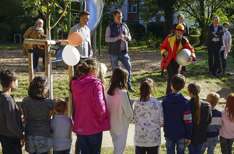 Zahlreich kamen die Kinder mit ihren Familien in den Ringmarkt, wo Quartiersmanager Mario Seitz zum Mitmach-Zirkus eingeladen hatte. Von dort aus zog die bunte Gruppe in Richtung „Elefantenspielplatz“. Der Spielplatz im Ulmenweg war bereits im Jahr 2020 fertiggestellt worden, doch die Pandemie hatte bisher kein Eröffnungsfest zugelassen. Umso größer war die Freude bei Mario Seitz angesichts der fröhlichen Veranstaltung: „Vielen Dank an alle Besucherinnen und Besucher, die unter Berücksichtigung des Hygienekonzepts beim Mitmach-Zirkus balancierten, jonglierten und auch auf dem Spielplatz viel Freude miteinander hatten.“