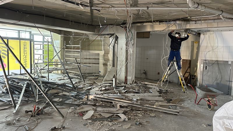 Aktuell läuft die Rückbauphase: Nicht tragende Zwischenwände, Decken sowie Boden- und Wandbeläge werden entfernt. Sobald die Räume vollständig entkernt sind, folgen die detaillierte Planung der Elektroinstallation und Innenausstattung sowie der Trockenbau.
