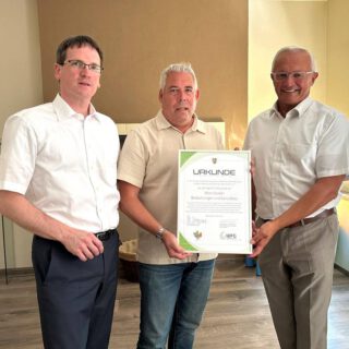 NEUWIED – Seit 90 Jahren erfolgreich in luftigen Höhen – Landrat Achim Hallerbach und Kreiswirtschaftsförderer Harald Schmillen gratulierten Dachdecker-Traditionsfirma Winn