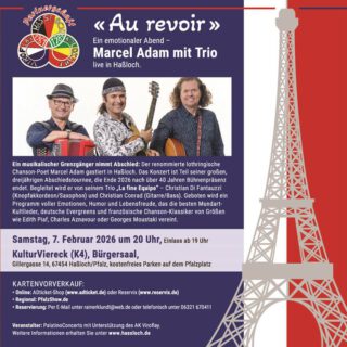 HASSLOCH – Ein emotionaler Abschied – Marcel Adam mit Trio live in Haßloch – Marcel Adam – „Au revoir“ – Der lothringische Chanson-Poet Marcel Adam lädt am 7. Februar 2026 zum Abschiedskonzert in das...
