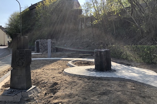 PRACHT – Der Ortseingang Pracht wird neu gestaltet – Der Ortseingangsplatz von Pracht, der den Namen „Uhu Platz“ trägt, wird derzeit neu gestaltet. Im oberen Bereich wird die Nachbildung des Stollenmundes der ehemaligen Bergbaugrube „Uhu“ aus dem Jahre 1987 saniert. Der untere Teil, der bisher immer als Grünanlage mit Sitzbank, Ortseingangsstein und Baum schlicht und einfach gestaltet war, wird neu angelegt. Mit dem Straßenbau der Straße „Am Hang“ im Jahr 2009 kam die Idee auf, eine Brunnenanlage auf der Grünfläche anzulegen. In der Straße vor dem Waschhaus ist eine Wasserquelle die als Versorgung für den Brunnen vorgesehen wurde.