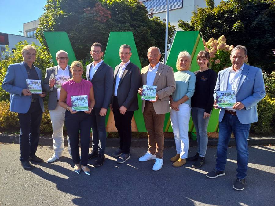 Foto: v.l.: Philipp Jung (Quest Team), Landrat Dr. Peter Enders (Kreis Altenkirchen), Sandra Köster (Wir Westerwälder), Fabian Herold und Dominik Herold (Westerwald Elektrotechnik Hummrich), Landrat Achim Hallerbach (Kreis Neuwied), Marieke Kosegarten-Jung (Quest Team), Sara Jung-Esper (Quest Team) und Landrat Achim Schwickert (Westerwaldkreis). Foto: Myriam Hatzmann