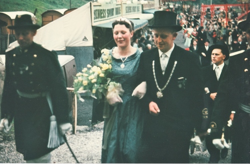 - zeigt Heinz Stahl, wie er voller Stolz 1956 die Königskette beim Einzug ins Festzelt trägt. Links ist Hofoffizier Hubert Heer zu sehen.