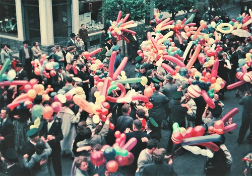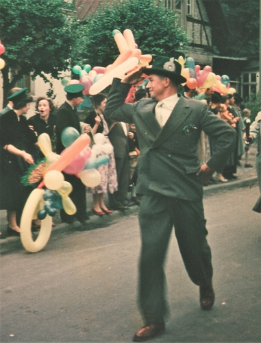 - zeigt das Ende des Ballonzugs. Man tanzt auf offener Straße und feiert ausgelassen das siebte Schönsteiner Schützenfest nach dem Zweiten Weltkrieg.