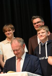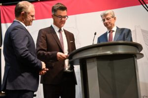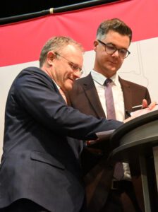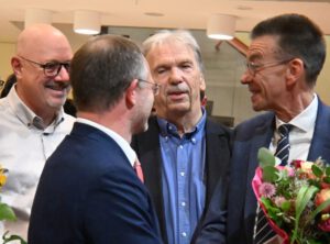 Die Stadtratssitzung am 9. Oktober 2025 war wohl eine der letzten größeren Termine im Neuwieder Heimathaus, dessen Ära am 31. Dezember 2025 ein Ende findet. Es soll für einen Neubau an gleicher Stelle abgerissen werden. Eine Zwischenlösung in einer mobilen Halle in Bahnhofsnähe nimmt inzwischen Gestalt an. Die Bodenplatte ist bereits fertig. Aber an diesem Abend wird erst mal im Anschluss an die Stadtratssitzung die feierliche Ernennung des alten und neuen Oberbürgermeisters der Deichstadt gefeiert. Der Kreis ist kleiner als bei der ersten Ernennung. Familie, Ratskollegen, eine Abordnung aus dem Rathaus, Zoo, Bank, SWN und GSG-chefs, ein Amtsvorgänger und ein paar gute Freunde lauschten den Reden der beiden Stadtvorstandskollegen Jung und Seemann und dem CDU-Fraktionsvorsitzenden Martin Hahn, bevor der alte und neue Oberbürgermeister das Rednerpult betrat.