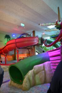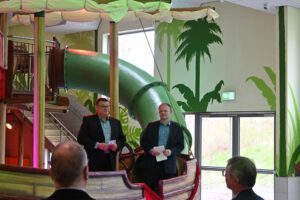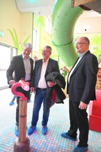 An der Hinterfront der Deichwelle war in den letzten Wochen ein 42 Meter langer und 16 Meter breiter Bau mit insgesamt drei Geschossen, sowie ein Technikkeller fertiggestellt. Das Erdgeschoss mit Lehrschwimmbecken und der Spraypark für die Kinder, sowie das Obergeschoss mit Ruhebereich für die Eltern und der Verwaltungstrakt für die Mitarbeiter der Deichwelle. Die Deichwelle ist als modernes Hallenbad besonders beliebt bei jungen Familien. Nicht selten werden Kindergeburtstage ins Freizeitbad verlegt. Hier kommt das neue Spaßbad mit seinen vielen Spielmöglichkeiten besonders an und zieht auch Besucher aus anderen Regionen an. Bei der Eröffnung war jedenfalls schon mal full House zu vermelden und wo viele andere Schwimmbäder geschlossen werden, ist dieses ein guter Tag für Neuwied und seine kleinen Wasserratten. (mabe) – Fotos: Marlies Becker