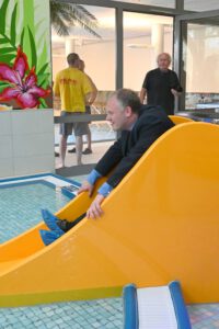 Kaum waren die Ehrengäste trockenen Fußes im Obergeschoss angekommen hieß es unten Wasser Marsch. Im Lehrschwimmbecken, das nun allen Neuwieder Grundschulkinder die Möglichkeit gibt, schwimmen zu lernen, war der absenkbare Boden heruntergefahren und Taucher konnten dort ihre Tauchgänge absolvieren.