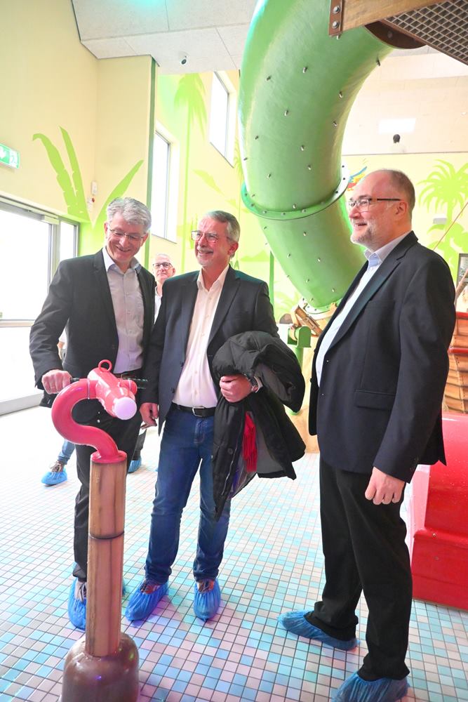 Nach drei Jahren Bauzeit und einer Investition von 10 Millionen Euro wurde am Sonntag das neue Lehrschwimmbecken und die Abenteuerinsel auf 240qm eingeweiht. Wasserkanonen, Rutschen, Kletterrohre, eine Flachwasserzone neue Spielaktionen, Papagei Pico und Schildkröte Martha konnten den zahlreichen Kindern nach der Einweihung durch OB Einig und Stefan Herschbach übergeben werden.