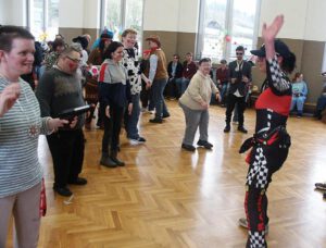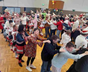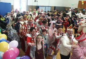 Auch die Westerwald-Werkstätten der Lebenshilfe in Steckenstein hatte der Karnevalsvirus voll erfasst. Gefeiert wurde wie immer im großen Mehrzwecksaal der Einrichtung und dies gewohnt ausgelassen. Schon vor dem Eintreffen der Wissener Tollitäten sangen die Beschäftigten aus voller Brust die einschlägigen Lieder mit und erfreuten sich im übrigen ihrer phantasievollen Kostümierung. Simon Reinfeld und Dennis Eutebach schoben die Stimmung mit ihrer Musikanlage auf immer neue Höhen. Dann wurde es Ernst im Saal. Der Narhalla-Marsch kündigte den Einzug des Dreigestirns an. Augenblicklich bildete man ein Spalier und wartete gespannt auf das was kommen sollte. Moderatorin Petra Baldus stimmte zu Ehren der Tollitäten ein dreifaches „Wissen o-jö-jo“ an. Natürlich gab es auch den Hausorden für die Gäste. Bäuerin Andrea I. revanchierte sich mit einem Dankeschön für den freundlichen Empfang. Dazu überreichte Prinz Thomas II. Frau Baldus den aktuellen Sessionsorden. Dann schob sich eine lange Polonaise durch den Festsaal. Man sah sich die Kostüme genau an. Ausgewählt wurden am Ende Marcel Rosenkranz (Süße Maus), Dzhmile Yaldaz (Djinn aus der Lampe) und Melanie Timm (Flamencotänzerin) für das schönste Outfit. Neben der Moderatorin beteiligte sich Juliane Held am Verteilen der Siegerurkunden. Nach der obligatorischen Büttenrede von Paul Sturm kam die hauseigene Manga-Tanz-Gruppe unter Leitung von Tobias Bender, Lydia Hasselhoff, Sarah Bauer und Jasmin Tawfeeky zu ihrem Recht. Am Schluss animierte Carina Hoffmann die Feiergemeinschaft noch zu einem gigantischen Flashmob. (bt) Fotos: Bernhard Theis