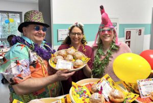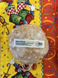 Mit einem süßen Gruß in Form von Berlinern wünschte die Geschäftsführung der BDH-Klinik Vallendar ihren Mitarbeitenden am Schwerdonnerstag schöne Karnevalstage. In diesem Jahr zierte erstmals das klinikeigene Logo die insgesamt 370 Exemplare. Der Ärztliche Direktor Dr. Guido Ketter ließ es sich erneut nicht nehmen, das „jecke“ Gebäck höchstpersönlich im gesamten Haus zu verteilen – unterstützt von einem pinkfarbenen Flamingo.