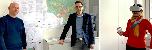 Foto (v.l.): Dag Irle (Bauamt Vg Kirchen), Tim Kraft (Bauamtsleiter VG Kirchen) Riccarda Vitt (Wirtschaftsförderung VG Kirchen) testen anwendungsbezogene VR Technik