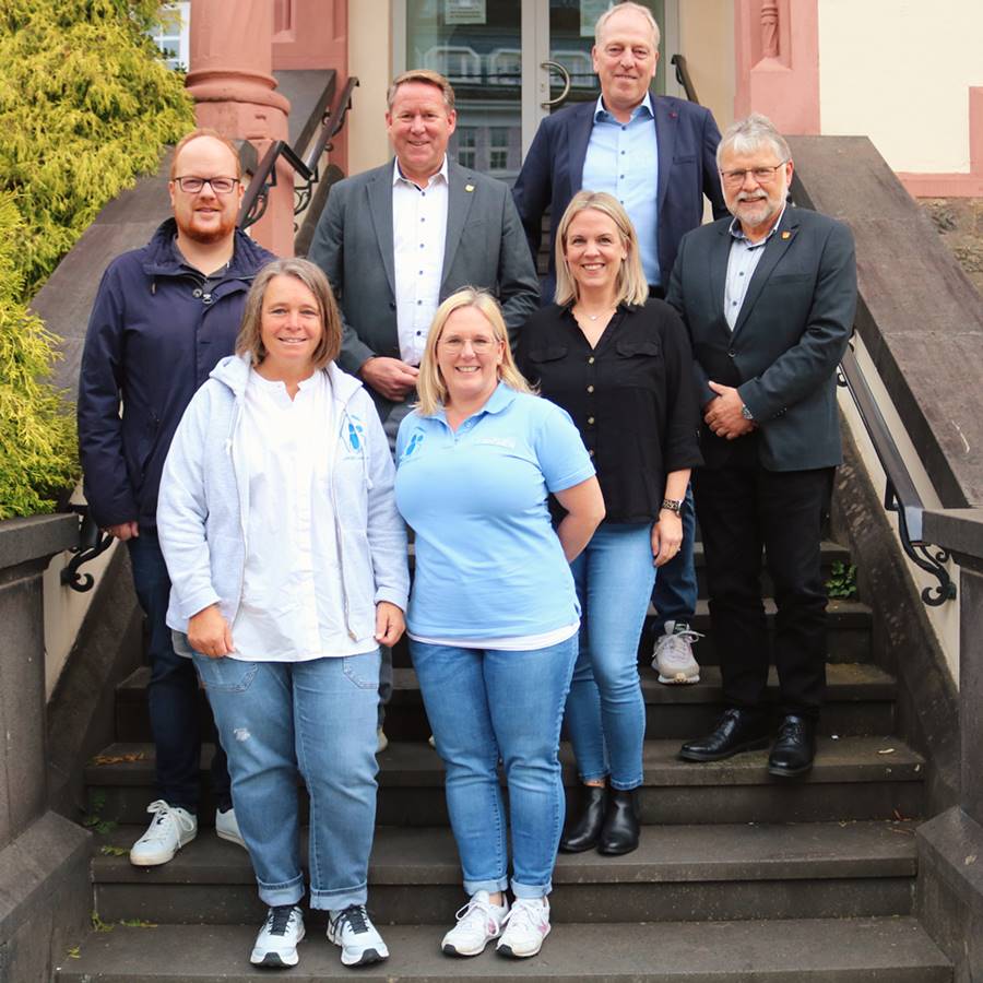 Foto: Die neue Gemeindeschwesterplus Bärbel Hellinghausen (vorne links) und ihre Kollegin Andrea Keßler (vorne rechts) wurden von den Bürgermeistern Andreas Hundhausen (links), Joachim Brenner (2. von links) und Helmut Stühn (rechts) im Beisein der Projektverantwortlichen Michaela Sandweg und Michael Becher am Betzdorfer Rathaus begrüßt.