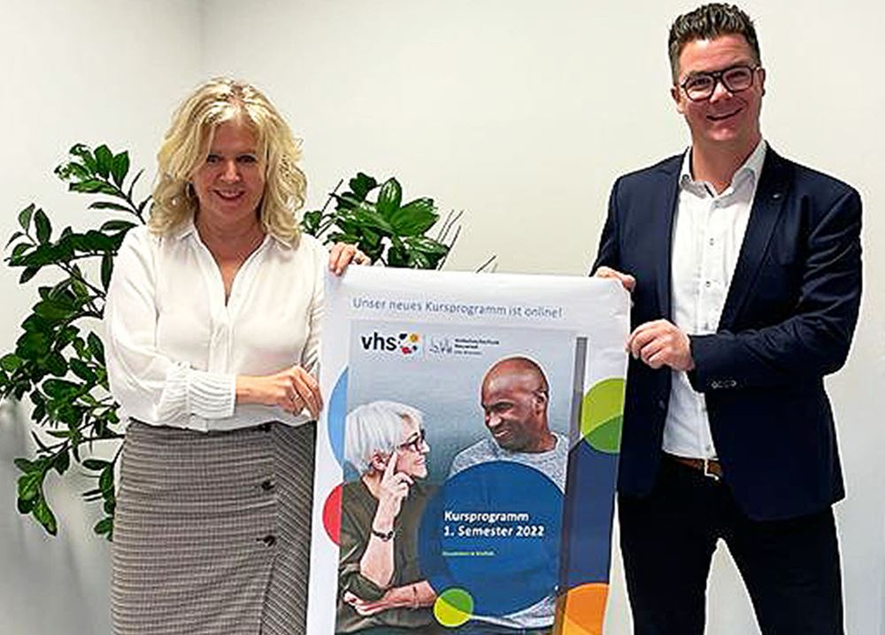 Foto: VHS-Amtsleiterin Jutta Günther und Bürgermeister Peter Jung präsentieren das Plakat mit dem Schwerpunktthema „Zusammen in Vielfalt“.
