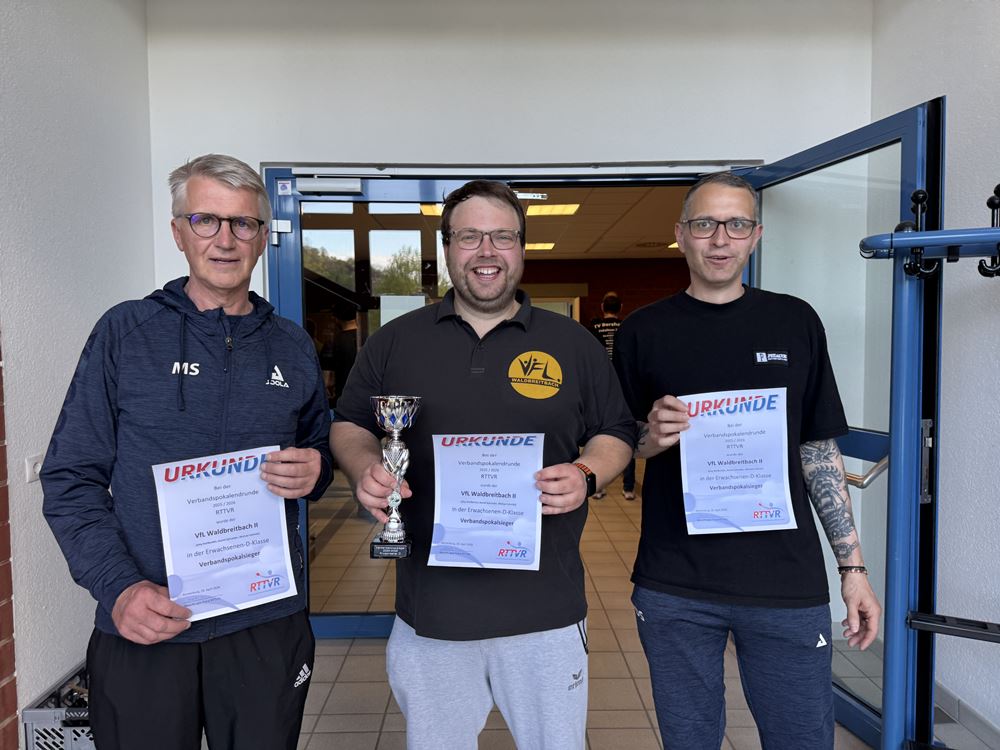 Für die 2. Mannschaft ging es im Erwachsenen D Pokal um den Titel: In der Aufstellung Jörg Weißenfels, Daniel Schneider und Michael Schmitz stand man nach Siegen gegen die TG Boppard und den TV Berzhahn im Finale gegen den TTC Wirges, welches durch ein 4:1 Erfolg gewonnen wurde. Somit gelang der Titelgewinn und der Pokal konnte mit nach Waldbreitbach genommen werden. „Ein Dank geht an die mitgereisten Fans, die den Weg nach Westerburg angetreten waren und die Mannschaften lautstark unterstützt haben“, so Jörg Weißenfels, Spieler und Abteilungsleiter Tischtennis/Badminton im VfL Waldbreitbach.