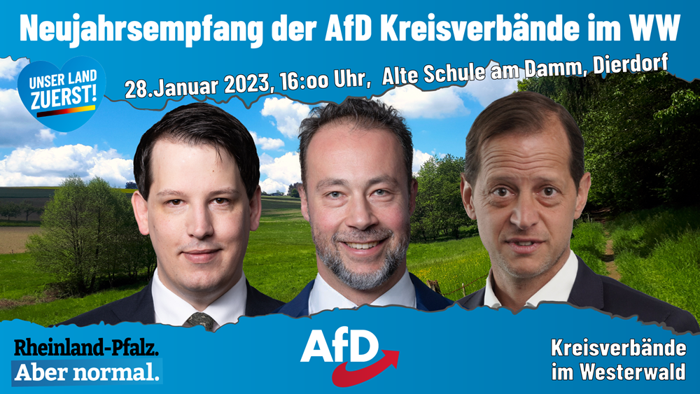 Die Westerwälder AfD-Verbände in den Landkreisen Neuwied, Altenkirchen, Westerwald, Rhein-Lahn und Mayen-Koblenz möchten ihre Zusammenarbeit vertiefen und laden als Auftakt zum gemeinsamen Neujahrsempfang am Samstag, 28. Januar 2023 ein. Die Veranstaltung findet ab 16 Uhr in der Alten Schule am Damm in Dierdorf im Landkreis Neuwied statt.