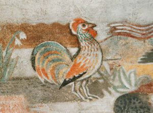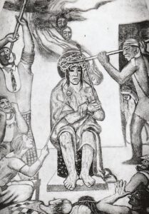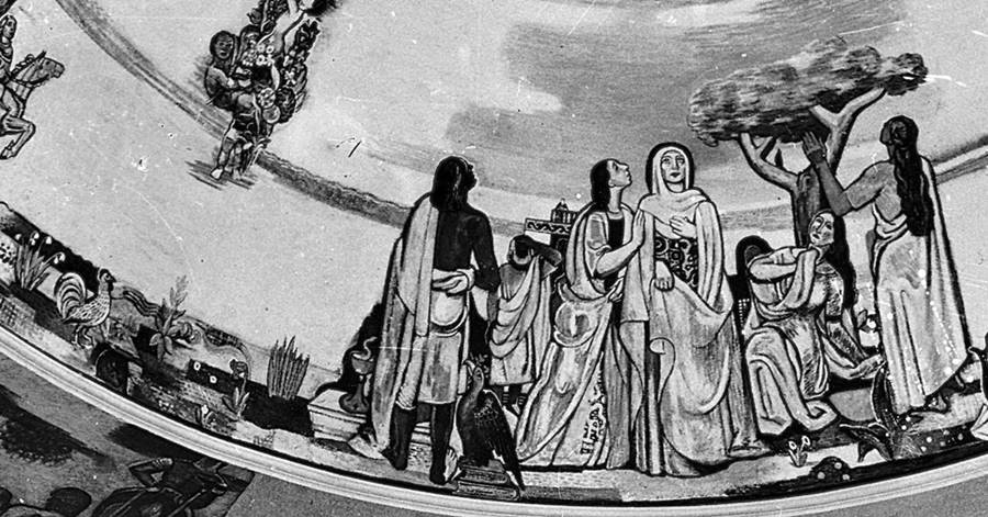 Am unteren Rand der riesigen, gerade erst wieder sanierten Kuppel in der katholischen Pfarrkirche Kreuzerhöhung zu Wissen kann man bei genauem Hinsehen einen Hahn erblicken. Im Christentum weist er auf Petrus hin, der in der Nacht vor der Kreuzigung Jesu drei Mal leugnete diesen zu kennen. Als der Hahn dann krähte, erinnerte er sich daran, dass Jesus ihm den Verrat angekündigt hatte. Petrus wurde sich seiner Tat bewusst und er weinte bitterlich. Der Hahn steht deshalb auch als Sinnbild für Reue und Umkehr. Die Darstellung des renommierten Künstlers Peter Hecker (1884 – 1971) gehört zu den Werken, die um 1930 in Wissen entstanden sind. Direkt unter der Rundung hat er in vier Szenen die Passion Christi höchst eindrucksvoll wiedergegeben. Besonders die Dornenkrönung mit dem schmerzverzerrten Gesicht des Erlösers sorgt noch heute für einen regelrechten Schauer. In dieser Szene wird Jesus von zwei Männern flankiert. Der rechte geht den Erlöser mit einem langen Knüppel an. In „Jesus fällt unter dem Kreuz“ bricht der Erlöser unter der Balkenkonstruktion zusammen. Dabei will ein Engel den Herrn vor seinen Peinigern beschützen. Die Aufnahme von vermutlich 1931 nach der Beendigung des umfangreichen Hecker`schen Bildwerks zeigt den unteren Rand der Kuppel mit dem schon erwähnten Hahn (li.) als Teil einer ausgedehnten Natursymbolik. Daneben sind rundum vier Apostelgruppen zu sehen. Hier, im östlichen Bildfeld, erkennen wir Maria in Begleitung von zwei Frauengestalten. (bt) Fotos (2) und Archiv (1): Bernhard Theis