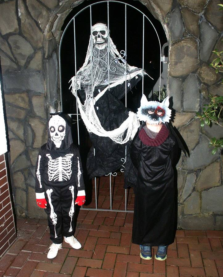 Das Wisserland wurde natürlich auch nicht von Halloweengeistern verschont. So machten beispielsweise zwei Gespenster, im Hintergrund durch ein freundliches Skelett verstärkt, den Höhenweg, Ende und das Mantelfeld im Stadtteil Köttingerhöhe unsicher. Das finstere Duo erwies sich dann aber als recht umgänglich und heimste an den Haustüren der Umgebung ordentlich Süßigkeiten ein. (bt) Foto: Bernhard Theis