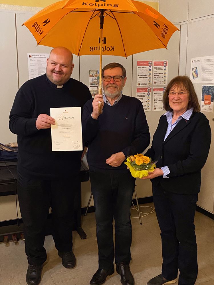 Das vom Vorstand ausgearbeitete Programm für die nächsten Monate wurde verteilt und es gab interessante Vorschläge für weitere Aktivitäten. Die stellvertretende Vorsitzende Brigitte Stricker – Lessenich und Kaplan Andrzej Bednarz ehrten dann den langjährigen und amtierenden Vorsitzenden Richard Walter für 60 Jahre Mitgliedschaft in dem Wissener Verein. Man erinnerte sich an interessante Fahrten zu Zielen im In – und Ausland, aber auch an Betriebsbesichtigungen und die jährliche Mitarbeit beim Wissener Jahrmarkt. Auch Richard Walter erhielt das traditionelle Jubiläumsgeschenk der Gemeinschaft – den nicht zu übersehenden Schirm des Kolpingwerks. Den Abschluss der Jahreshauptversammlung bildete wie immer das gemeinsame Kolpinglied.