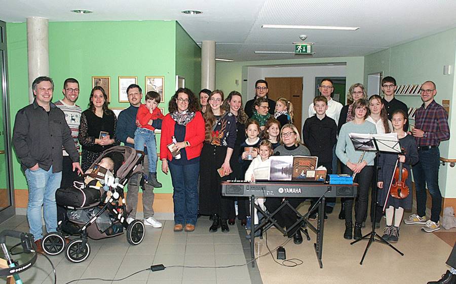 Seit fast 35 Jahren erfreut ein Jugendchor die Bewohner des Wissener Seniorenheims „St. Hildegard“ stets an Heiligabend mit festlichen Liedern. Und jedes Mal warten die Bewohner auf den Fluren sehnsüchtig auf die Sängerinnen und Sänger. Am Mittwoch war es wieder soweit. Auf einer der Etagen stimmte man sich mit „Fröhliche Weihnacht überall“ ein. Der etwa 30-köpfige Spontanchor hatte noch das Krippenspiel in der Pfarrkirche „St. Katharina“ in Schönstein begleitet und sich dann auf den Weg nach Wissen gemacht. Viele Mitglieder sind seit langer Zeit dabei und stets kommen auch neue Sänger dazu. Diesmal hatte man auffallend viele Kinder, meistens die eigenen dabei. Das jüngste war kaum ein Jahr alt. Leiterin Simone Bröhl stimmte wie immer mit ihrem Keyboard die einzelnen Stücke an, die Kinder Mara Wittershagen und Sarina Bröhl fielen mit Querflöte und Geige ein. Es erklangen die schönen alten Weihnachtslieder wie „Stille Nacht“, „Oh du fröhliche“, „Stern über Bethlehem“ oder „Leise rieselt der Schnee“. Die Zuhörer lauschten ergriffen und fühlten sich sicherlich an vergangene Zeiten erinnert: „Die jungen Leute machen uns am Tag vor Weihnachten eine große Freude!“, so eine der älteren Zuhörerinnen. Aber auch für die Sängerinnen und Sänger gehört der Auftritt im „St. Hildegard“ längst zu einem liebgewonnenen Ritual an Heiligabend. Für einige von Ihnen ist es sogar Grund genug, sich wieder einmal in der Heimat sehen und vor allem hören zu lassen. Im Namen von Bewohnern und Verwaltung bedankte sich Beate Rödder vom Sozialdienst am Schluss bei allen, die hier gerade so engagiert und besinnlich auf die Weihnachtszeit eingestimmt haben: „Schöne Feiertage und ein glückliches Neues Jahr!“. Diesmal stand sogar eine besondere Überraschung auf dem Programm. Auf der Rasenfläche vor dem Balkon der Einrichtung präsentierte Rebecca Rödder den Bewohnern eine Feuershow der Spitzenklasse. Auch ihr galt starker Beifall. Weiterhin hatten sich kurz vor Weihnachten zur Freude der Hildegardianer die Wissener Feuerwehrkapelle und der Chor TonArt angesagt. (bt) Fotos: Bernhard Theis