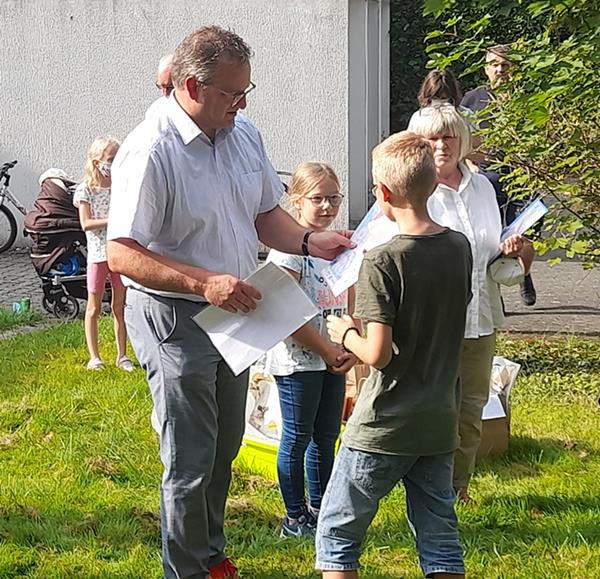 Der Lesesommer hatte in Zusammenarbeit mit der Evangelischen Bücherei stattgefunden. Ausgeliehen werden konnte der Lesestoff zwischen dem 5. Juli und 4. September in beiden Einrichtungen. Wer mindestens drei Bücher gelesen hatte, bekam nun eine Urkunde überreicht. Pastor Martin Kürten hatte diese Aufgabe gerne übernommen und verwies in einer kleinen Ansprache auf die Bedeutung des Lesens besonders in schwierigen Zeiten: „Schön dass Ihr die Zeit zum Ausleben der Phantasie genutzt habt“. Bürgermeister Berno Neuhoff zeigte sich überrascht und erfreut von dem starken Interesse junger Leute an der Lektüre interessanter Bücher: „Ganz toll wie Ihr das hinbekommen habt!“