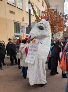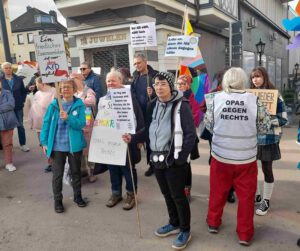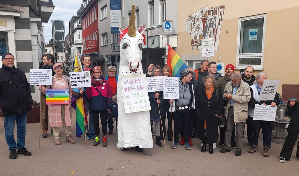 Manuel Viana Rodriguez, Sprecher des Ortsverbands Hamm-Wissen der BÜNDNIS 90/Die Grünen zeigte sich am Ende sehr zufrieden: „Wir haben Flagge gezeigt und unter Beweis gestellt, dass Hass und Hetze keine Option sind“. Man hatte am Samstag zu einer Mahnwache vor dem ehemaligen Wissener Postamt eingeladen. Anlaß war ein Infostand der AfD an gleicher Stelle. Unter den Augen von einem halben Dutzend Polizeibeamten standen sich die Gruppierungen gegenüber und verhielten sich ausser einigen wenigen eher unfreundlichen Zufrufen friedlich. „Lebe so dass die AfD etwas dagegen hätte“, oder „Menschenrechte statt rechte Menschen!“ war auf den Plakaten zu lesen. Ganz vorne mischten „Omas und Opas gegen Rechts“ mit. Erschienen war sogar ein riesiges Fabeltier, ein Einhorn mit Regenbogenfahne. Der Grünensprecher zählte nach einigen Stunden fast 50 Teilnehmer, darunter auch Mitglieder von SPD, CDU und FWG aus Wissen. Auf der Gegenseite waren es etwa zwei Dutzend Personen. (bt) Fotos: Bernhard Theis