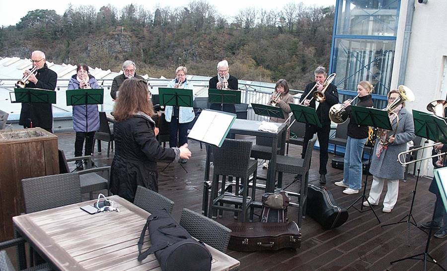 Seit langem erfreut der Posaunenchor der evangelischen Kirchengemeinde Wissen am Ostersonntag in aller Frühe mit mehreren Musikstücken unter freiem Himel. So auch jetzt wieder. Der Tag begann mit einem Ostergottesdienst in der evangelischen Kirche. Man entzündete die Osterkerze, die dann an jeden Gottesdienstbesucher weitergeben wurde. Zudem duften alle eine kleine Kerze mit nach Hause nehmen. Noch während sich die Gemeinde zum gemeinsamen Frühstück versammelte, begab sich der Posaunenchor, der sich über einige Neuzugänge freute, auf die Dachterrasse des Kulturwerks und packte dort seine Instrumente aus. Unter der Leitung von Sabine Roesner stimmte man unter anderem „Christ ist erstanden“, „Der schöne Ostertag“, „Erschienen ist der herrlich Tag“ und „Auf, Auf, mein Herz mit Freuden“ an. Zum Abschluss schickte man traditionell das Lied „Wir wollen alle fröhlich sein“ über Wissen hinweg. Natürlich gab es auch Ostereier als kleine Anerkennung für alle Spielerinnen und Spieler. Für seinen nächsten Einsatz lädt der Posaunenchor zum Festgottesdienst aus Anlass des 100-jährigen Jubiläums der evangelischen Kindertagesstätte „Apfelbaum“ ein. Er findet am 26. April statt. Ein besonderer Höhepunkt wird wieder ein „Gottesdienst am besonderen Ort“ sein. Während man im letzten Jahr zu Gast im Feuerwehrhaus war, beehrt man am 30. August 2026 Schloss Schönstein (Foto), worauf sich die Aktiven schon jetzt mächtig freuen. (bt) Fotos: Bernhard Theis (3), Archiv (1).