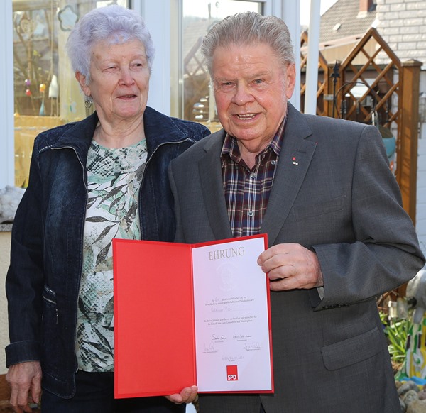 Daher suchte der Vorsitzende des SPD-Ortsvereins die Jubilare mit gebotenem Corona-Abstand zu Hause auf. Waldemar Roos, gemeinsam mit seiner Ehefrau Edith, wurde für seine 60jährige Mitgliedschaft bei den Sozialdemokraten geehrt.