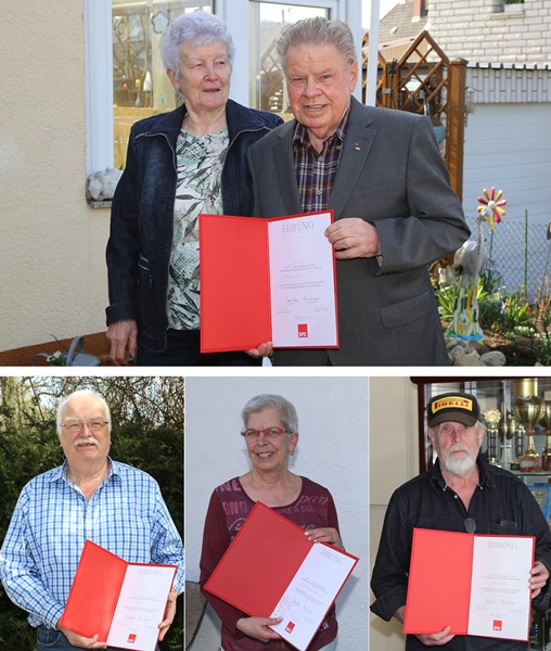 Uwe Schernus, unten links im Bild, langjähriger Schatzmeister des Ortsvereins, erhielt eine Auszeichnung für 50 Jahre Mitgliedschaft. Seit 40 Jahren sind