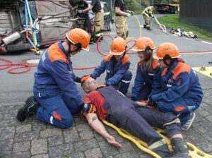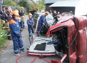 Auch die Freiwillige Verbandsgemeindefeuerwehr Wissen sowie das Betzdorfer THW nahmen mit starken Kräften am ersten landesweiten Übungstag teil. Am Samstag konzentrierte man sich auf drei Szenarien. Demnach war am Steilhang an der Alten Poststraße eine Person abgestürzt und musste aufwendig geborgen werden. Mithilfe eines Schleifkorbs an langen Seilen gelang dies auch mit einiger Mühe. Weiterhin galt es ein angebliches Problem in der Musikschule des Kreises Altenkirchen/ehemaliges Gymnasium zu lösen. Die größte Herausforderung hatte man sich jedoch für die obere Böhmerstraße im Wissener Stadtteil Köttingerhöhe einfallen lassen. Vor dem Hause Hester lagen zwei beängstigend realistisch demolierte Pkws auf der Seite. Hier hatte sich offenbar ein schlimmer Unfall ereignet. Mehrere Personen waren eingeklemmt und mussten mit der Rettungsschere unter höchsten Sicherheitsanforderungen befreit werden. Zurück blieben nur die völlig zerstörten Wracks. Mit von der Partie waren hier auch einige Angehörige der Jugendfeuerwehr. Sie sahen sich im Rahmen ihrer eigenen 24-Stunden-Übung den Ablauf der Rettungsmaßnahmen genau an und kümmerten sich um die geretteten „Personen“. Nachdem die Unfallstelle geräumt war, begaben sich die rund 60 Kräfte von Feuerwehr und THW ins Schönsteiner Feuerwehrhaus. Dort liess die Wehrleitung den Übungsablauf noch einmal Revue passieren und bedankte sich für das Engagement der ehrenamtlichen Kameraden. Nach dem offiziellen Teil folgte dann der verdiente Imbiss für alle Teilnehmer. (bt) Fotos: Bernhard Theis