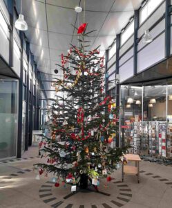 Die Wissener Werbegemeinschaft „Treffpunkt“ hat wieder für einen schönen Weihnachtsbaum gesorgt. Er steht wie immer in der großen Halle des Regiobahnhofs. Diesmal haben ihn die Kinder der Tagesstätte „Adolph Kolping“ mit selbstgemachtem Schmuck behängt. Der Baum bietet einen wahrhaft festlichen Anblick und versüsst die Zeit bis zum Fest, da sind sich wohl alle Passanten einig. (bt) Fotos: Bernhard Theis