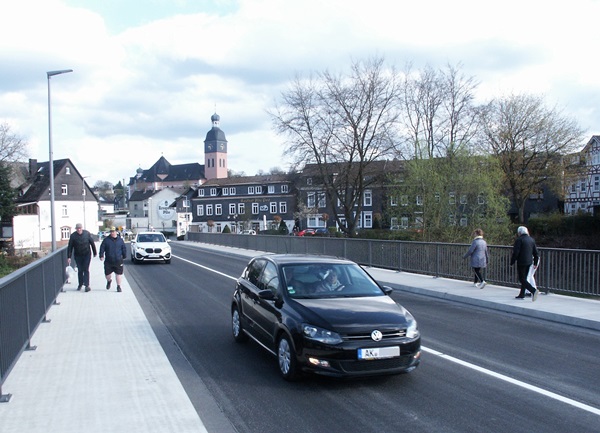 Spätestens am Sonntag, 02. Mai 2021, hatten sich die Wissener ihre Siegbrücke zurückerobert. Fußgänger als auch motorisierte Verkehrsteilnehmer nutzten eifrig den soeben fertiggestellten Flussübergang. Als Eröffnungstermin hatte man ursprünglich den Montag terminiert, was sich damit erübrigt. (bt) Foto: Bernhard Theis