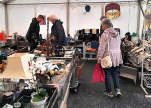 Schmitz-Avila zeigte sich angetan von den vielen Helferinnen und Helfern vor Ort: „Das ist wirklich vorbildlich!“. Eine Mitarbeiterin von Don Bosco e.V. machte mit einem Hilfsprojekt auf Sri Lanka bekannt. Dort gibt man auch mit der Wissener Unterstützung unterprivilegierten Jugendlichen die Chance, sich  aus dem Kreislauf der Armut zu befreien. In diesem Jahr fördert der Verein ein Projekt für 2.000 benachteiligte Kinder in Kolumbien. Nach Grußworten von Pfarrer Marcus Tesch und Pastor Martin Kürten für die evangelische bzw. katholische Kirchengemeinde, sagte Bürgermeister Berno Neuhoff: „Wir stehen hier für die größte heimische Bürgerinitiative, toll!“ Er dankte auch den Nachbarn für ihr Verständnis an beiden Veranstaltungstagen. Dann machte man sich auf den Weg und besuchte die rund 30 Verkaufsbuden, Das große Trödelzelt stand diesmal vor dem Rathaus, ebenso die Stände für Kunstgewerbeartikel und Bücher. Die Wissener Tafeln servierten erstklassige Erbsensuppe und auch die Waffeln aus eigener Herstellung an einem benachbarten Stand kamen sehr gut an. Es braucht vermutlich nicht extra betont zu werden, der Reinerlös fliesst vollständig in das erwähnte Hilfsprojekt. (bt) Fotos: Bernhard Theis