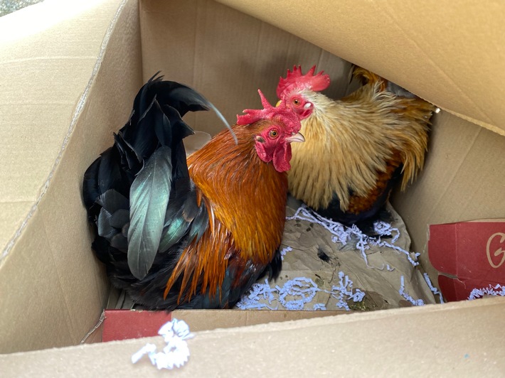 Am Montag, 03. April 2023, wurde die Polizeiautobahnstation Kaiserslautern von der Autobahnmeisterei Wattenheim verständigt. Gegen 09:45 Uhr wurde an der Salzhalle an der Autobahnausfahrt Enkenbach-Alsenborn ein mit Klebeband verschlossener Karton gefunden. Beim Öffnen entdeckten die überraschten Arbeiter zwei Hähne, die man scheinbar einfach ihrem Schicksal überlassen hatte. Bei der ersten Inaugenscheinnahme der Tiere wurde festgestellt, dass diese deutlich unterernährt waren. Zudem konnte man annehmen, dass sie aufgrund ihrer langen Krallen in ihrem bisherigen Leben wenig Auslauf hatten. Die Hähne wurden in die Obhut des Tierschutzes übergeben. Im Rahmen der Ermittlungen bittet die Polizeiautobahnstation um Hinweise. Quelle und Foto: Polizei